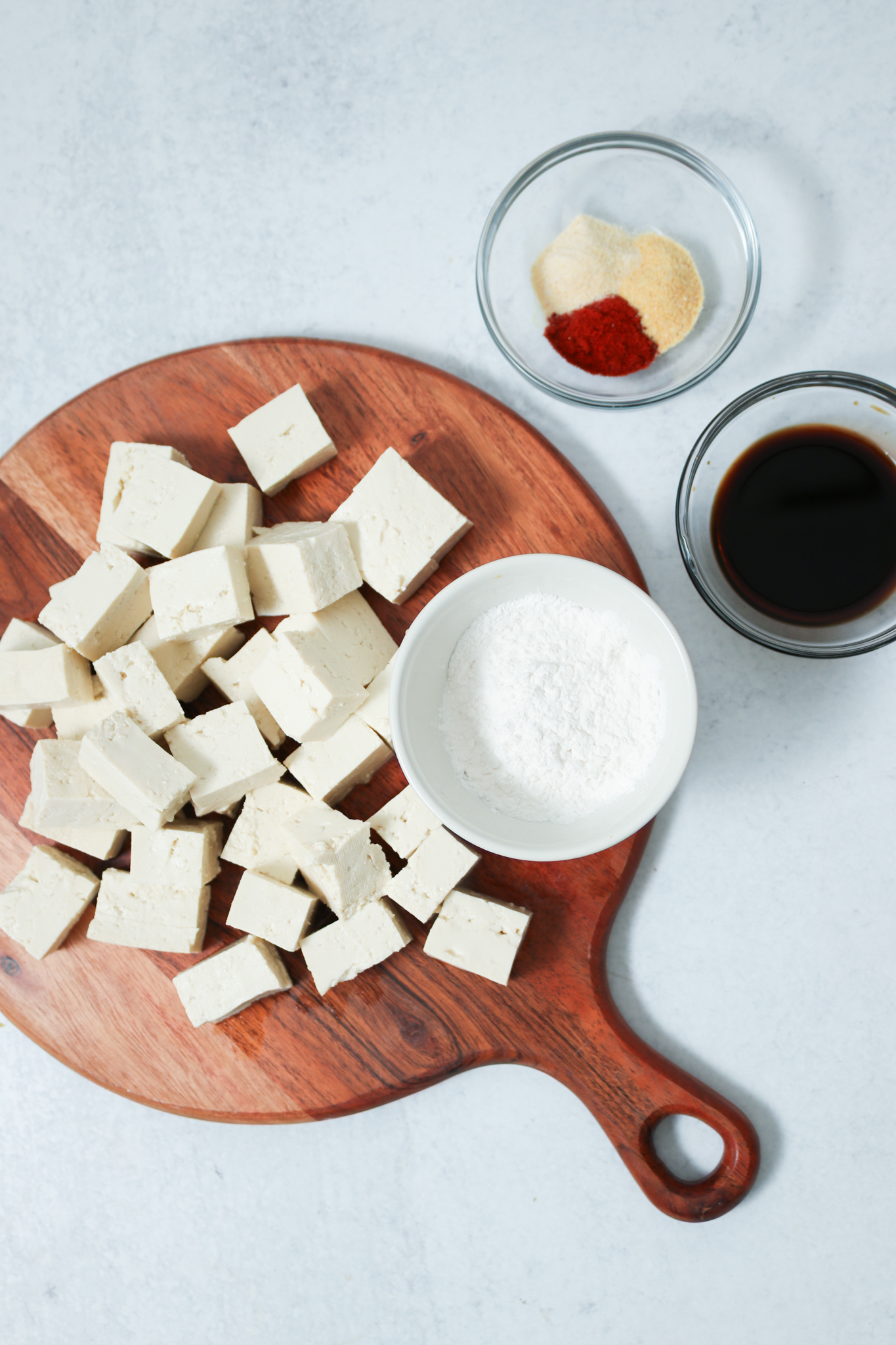 Slice tofu: Cut a block of extra firm tofu into 1-inch cubes.