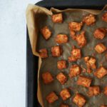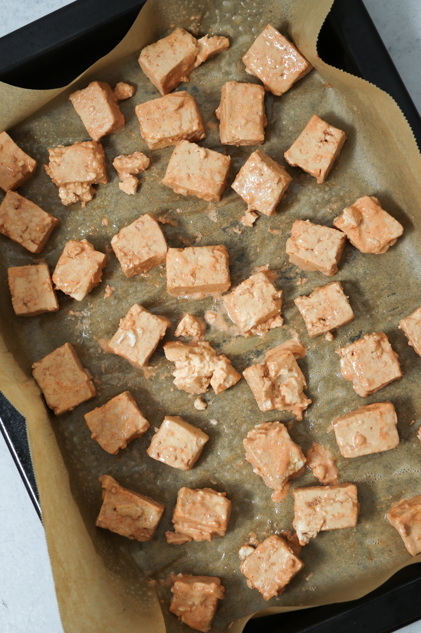 Bake: Spread tofu out on a parchment-lined baking sheet and bake at 400°F for 25 minutes, or until crispy and golden.
