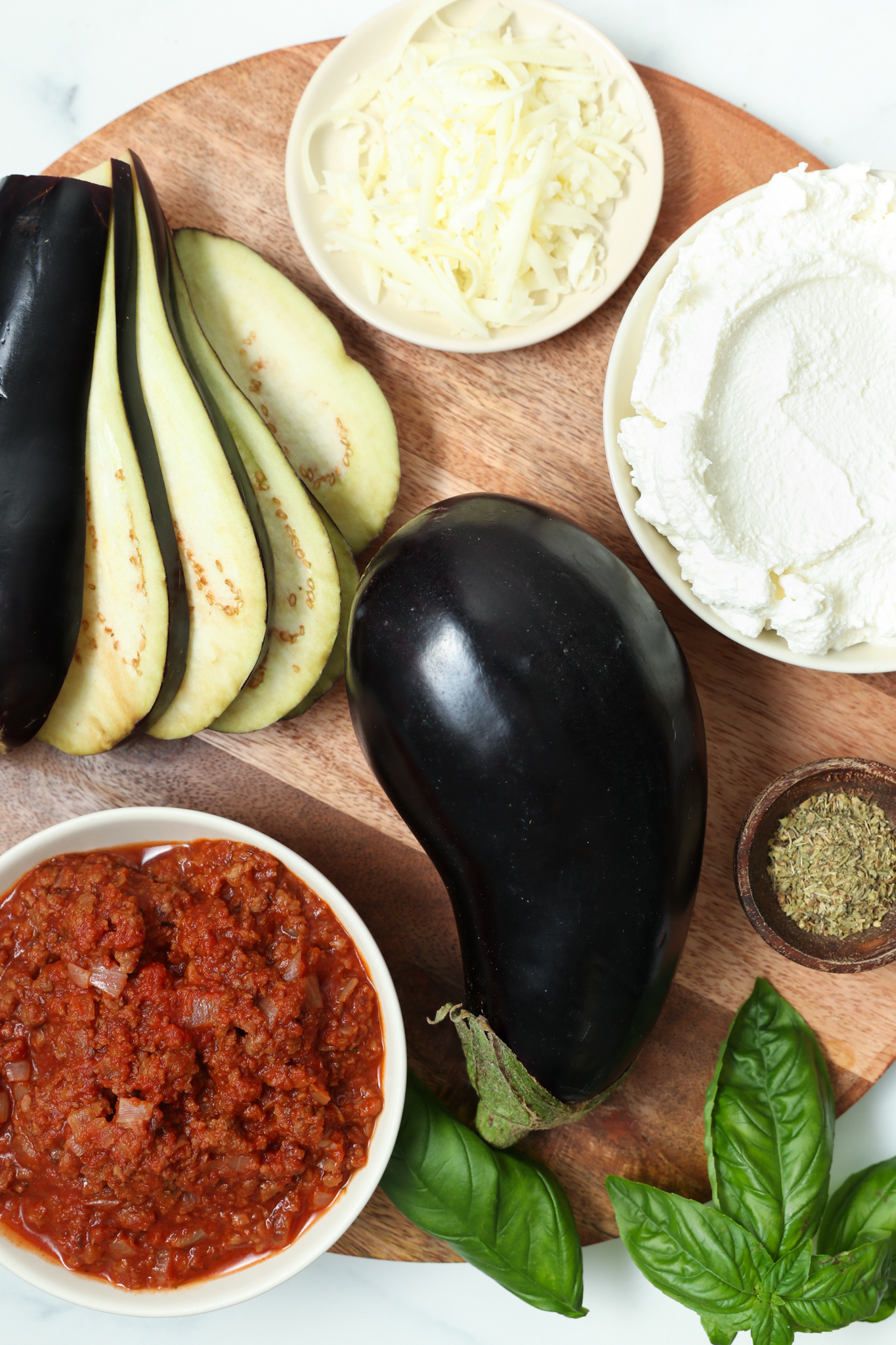 Layer the lasagna: In a 10×7-inch baking dish, spread a few spoonfuls of meat sauce to coat the bottom. Add a layer of roasted eggplant slices. Spread a layer of the spinach ricotta mixture. Spoon meat sauce on top. Repeat the layers until the eggplant slices are used up.