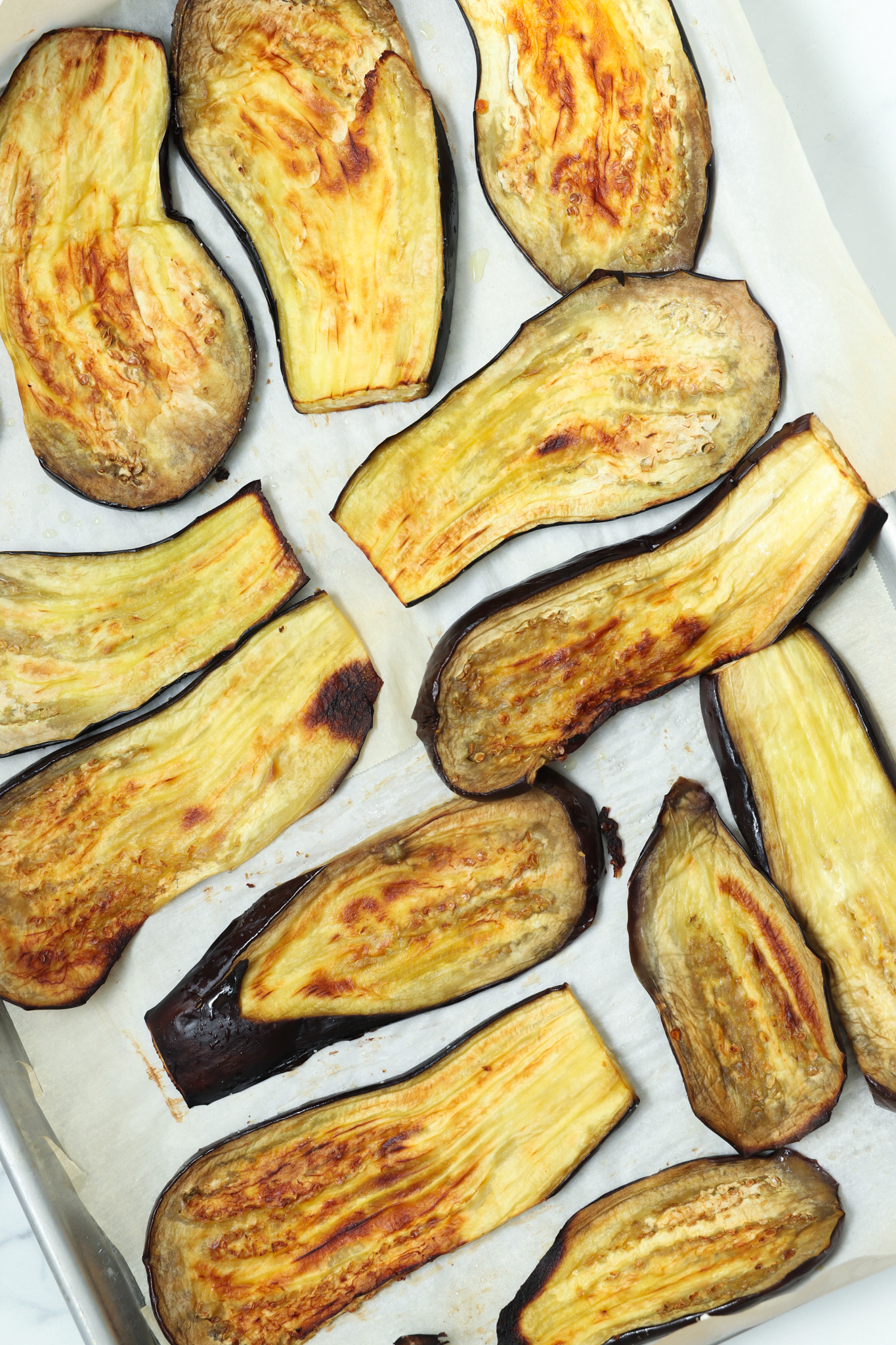 Prepare the eggplant: Slice eggplants lengthwise into ¾-inch thick slices. Line a baking sheet with parchment paper. Brush both sides of each slice with olive oil and season lightly with salt and pepper. Roast in the oven for 15 minutes, or until browned and softened. Remove and let cool. Lower oven temperature to 375°F (190°C).