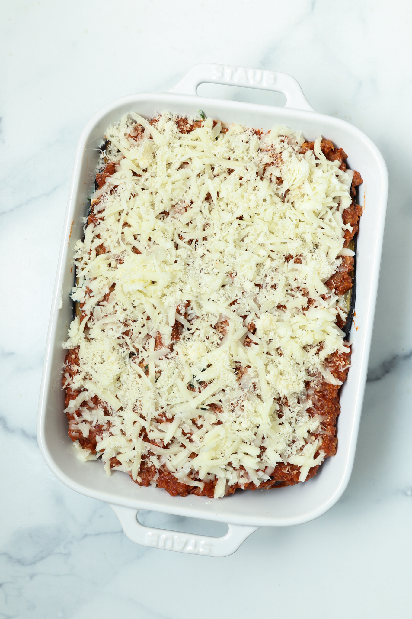 Finish with one more layer of sauce and a blanket of mozzarella cheese on top.