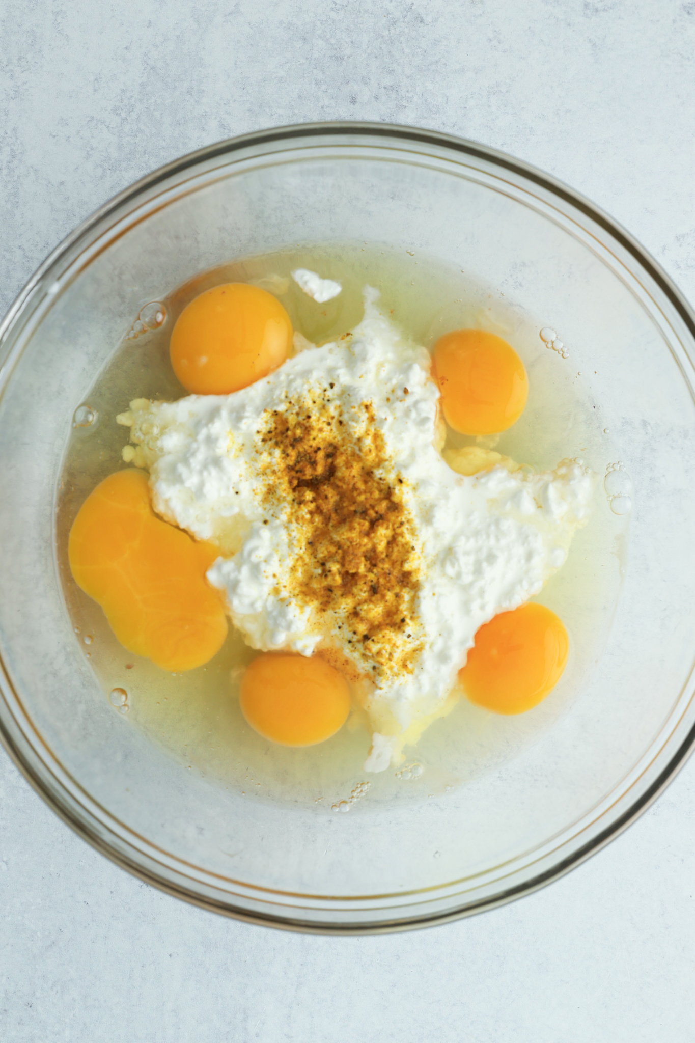 In a blender, crack 5 eggs and add the cottage cheese. Blend until smooth. (If using an immersion blender, combine eggs and cottage cheese in a large glass bowl and blend until smooth.)