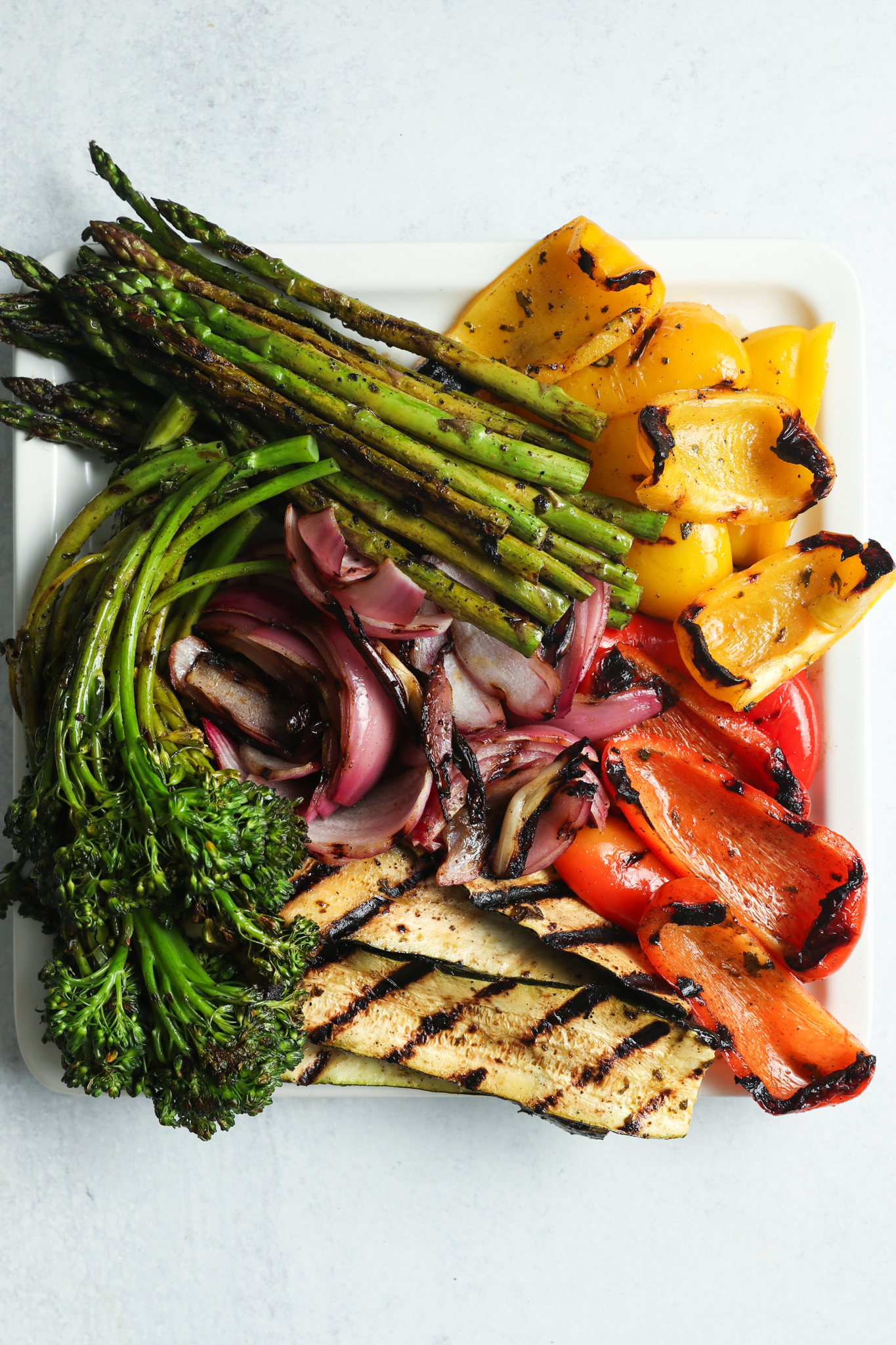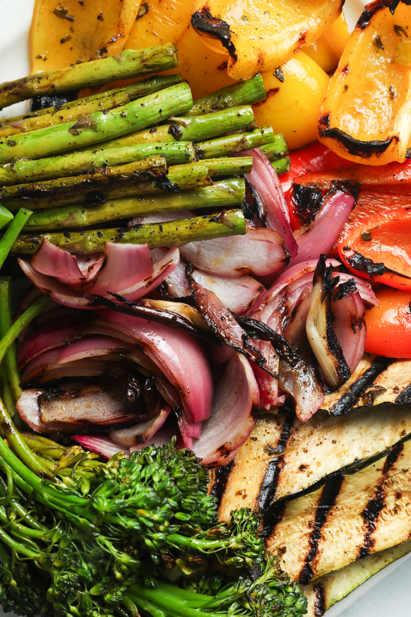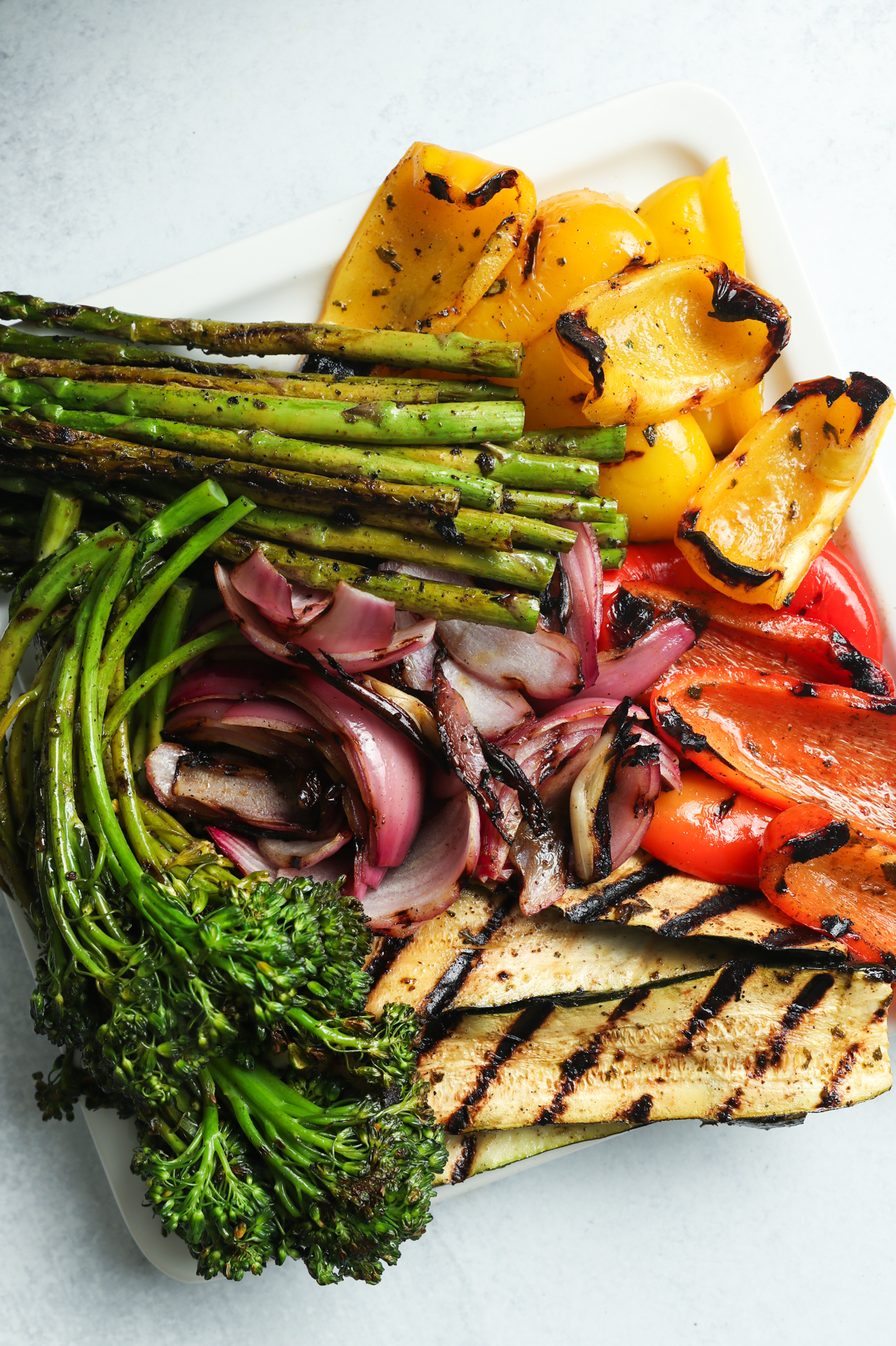 Preheat your grill or grill pan to medium-high heat. Grill the vegetables in batches, turning occasionally until charred and tender. Cooking times will vary slightly—asparagus, zucchini and bell peppers grill quickly (4–6 minutes per side), while broccolini and onions may need a little longer (6–8 minutes per side).