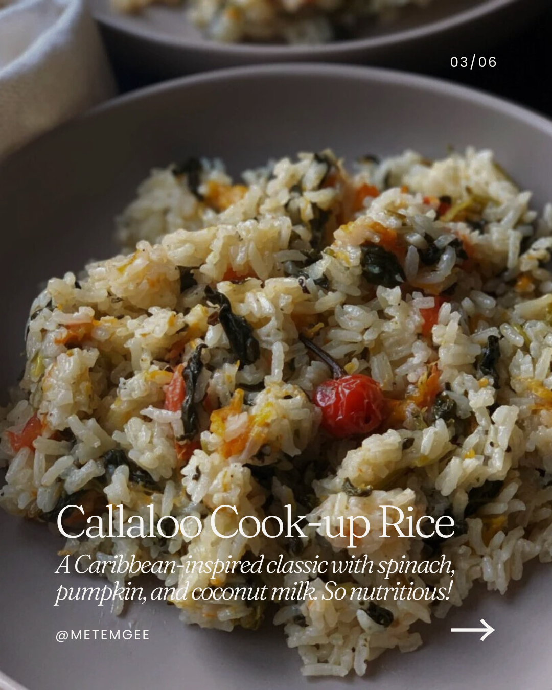 Another gem I've found is Metemgee by Althea Brown. As a fellow Caribbean woman, her recipes take me back to my childhood in New York. In my family, rice is a staple at every gathering, and Althea recently shared a stunning recipe for Callaloo Cook-up Rice, featuring spinach, pumpkin, and coconut milk. It’s a testament to how rice can be both delicious and nutritious, especially when paired with vibrant vegetables. This dish is perfect to elevate your savory menu!